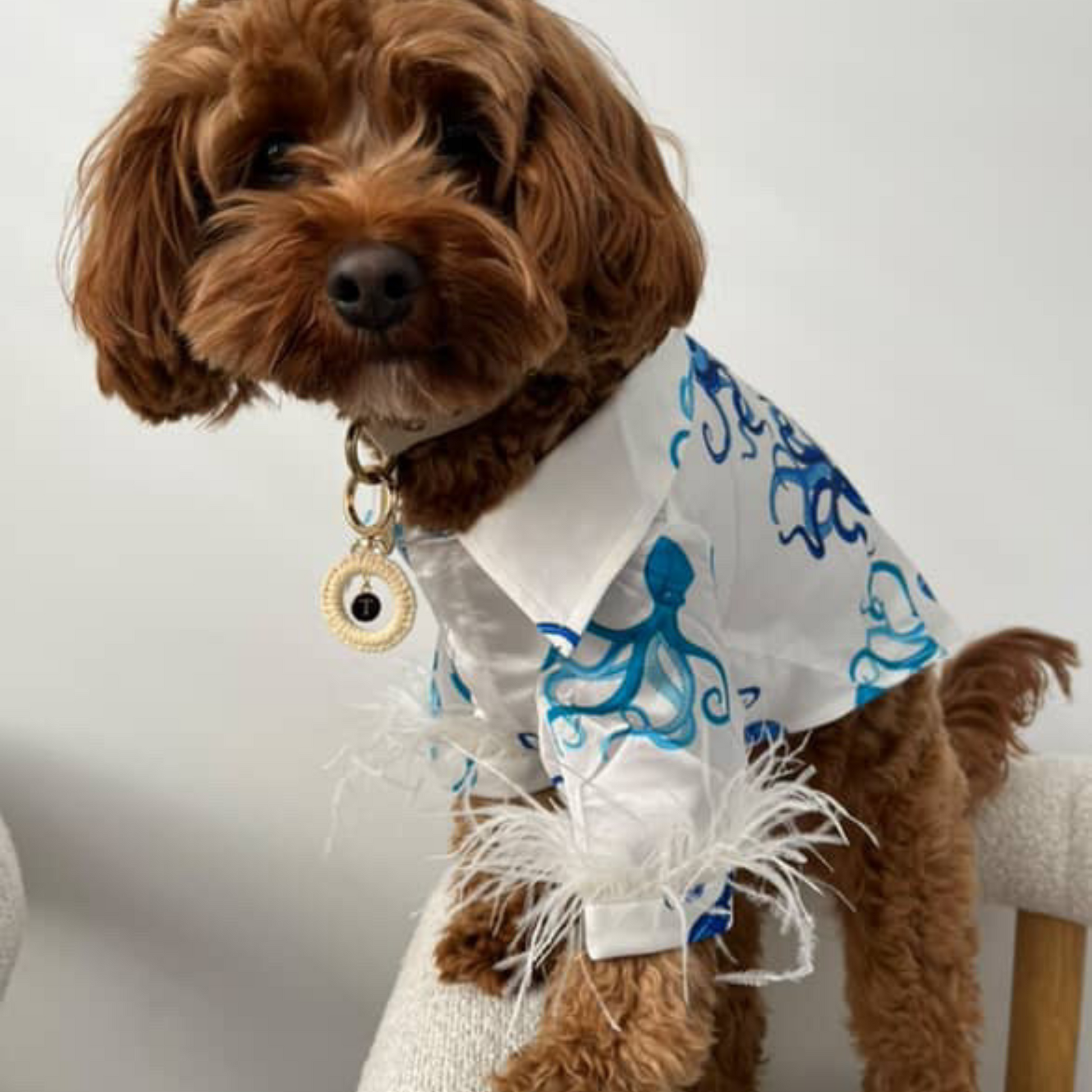 Hand-drawn octopus details and soft feathered trims bring effortless elegance with just the right splash of drama — for those who like their sleepwear anything but ordinary. Your pup’s matching mini-octopus sketch makes the perfect pair.